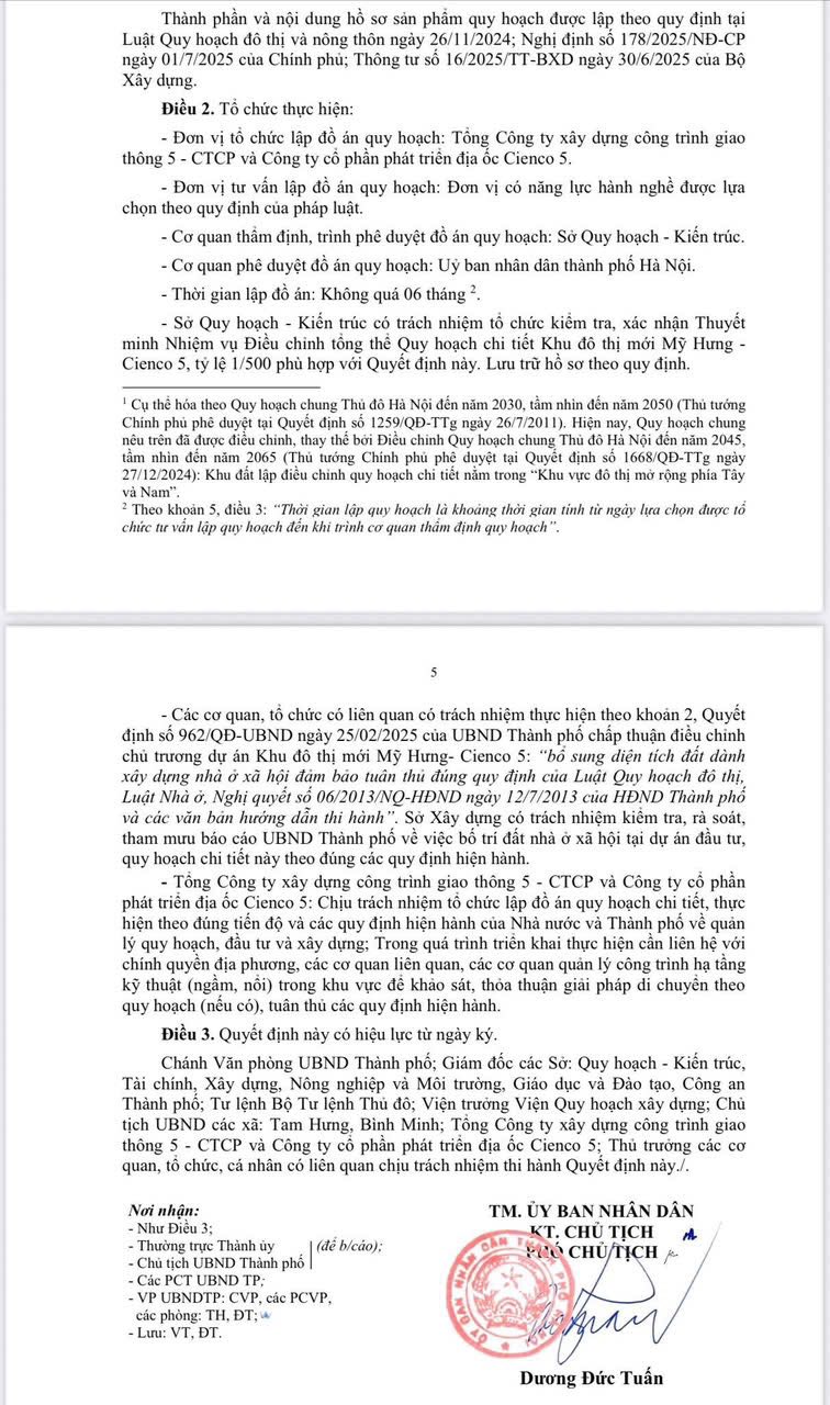 • Ngày 2/8/2025, UBND TP Hà Nội đã phê duyệt nhiệm vụ điều chỉnh tổng thể quy hoạch chi tiết 1/500 khu đô thị Mỹ Hưng – Cienco5, thuộc các xã Tam Hưng, Bình Minh (Thanh Oai).