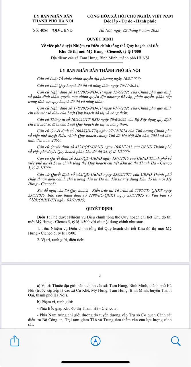 Văn bản của Hà Nội phê duyệt 1/500 mới của dự án Mỹ Hưng Cienco5.